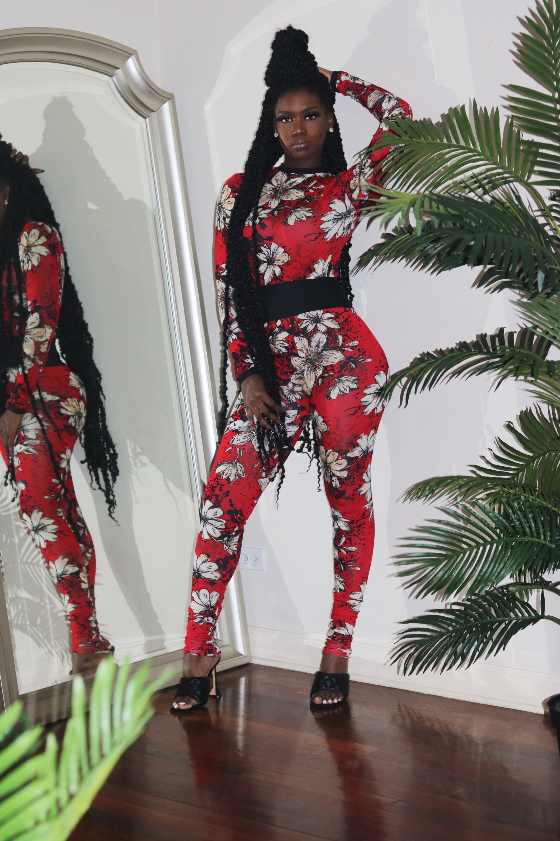 Red, black and white floral print long sleeve shirt and matching high-wasted leggings with black waistband. Very soft and comfortable fabric & has great stretch.