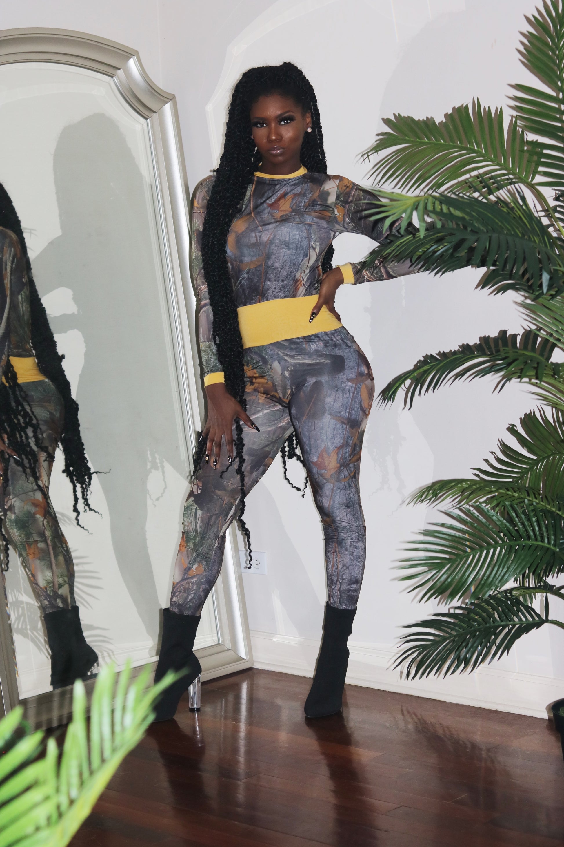 Tree print long sleeve shirt and matching high-wasted leggings with yellow accents. Very soft and comfortable fabric & has great stretch.
