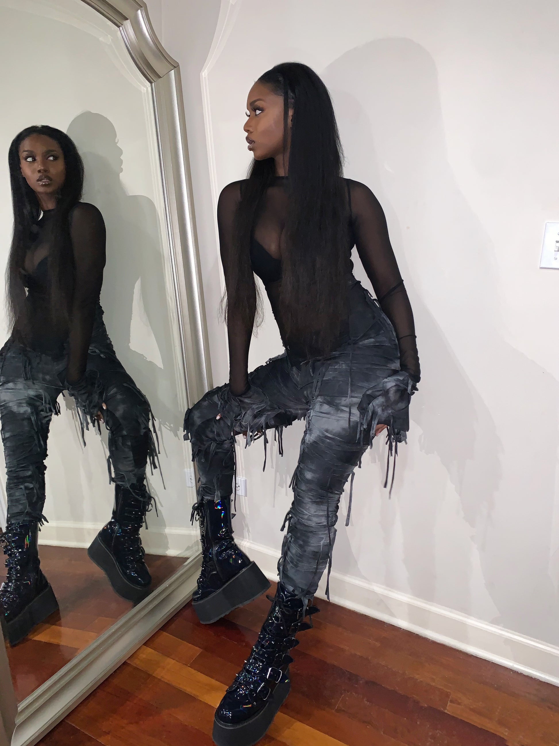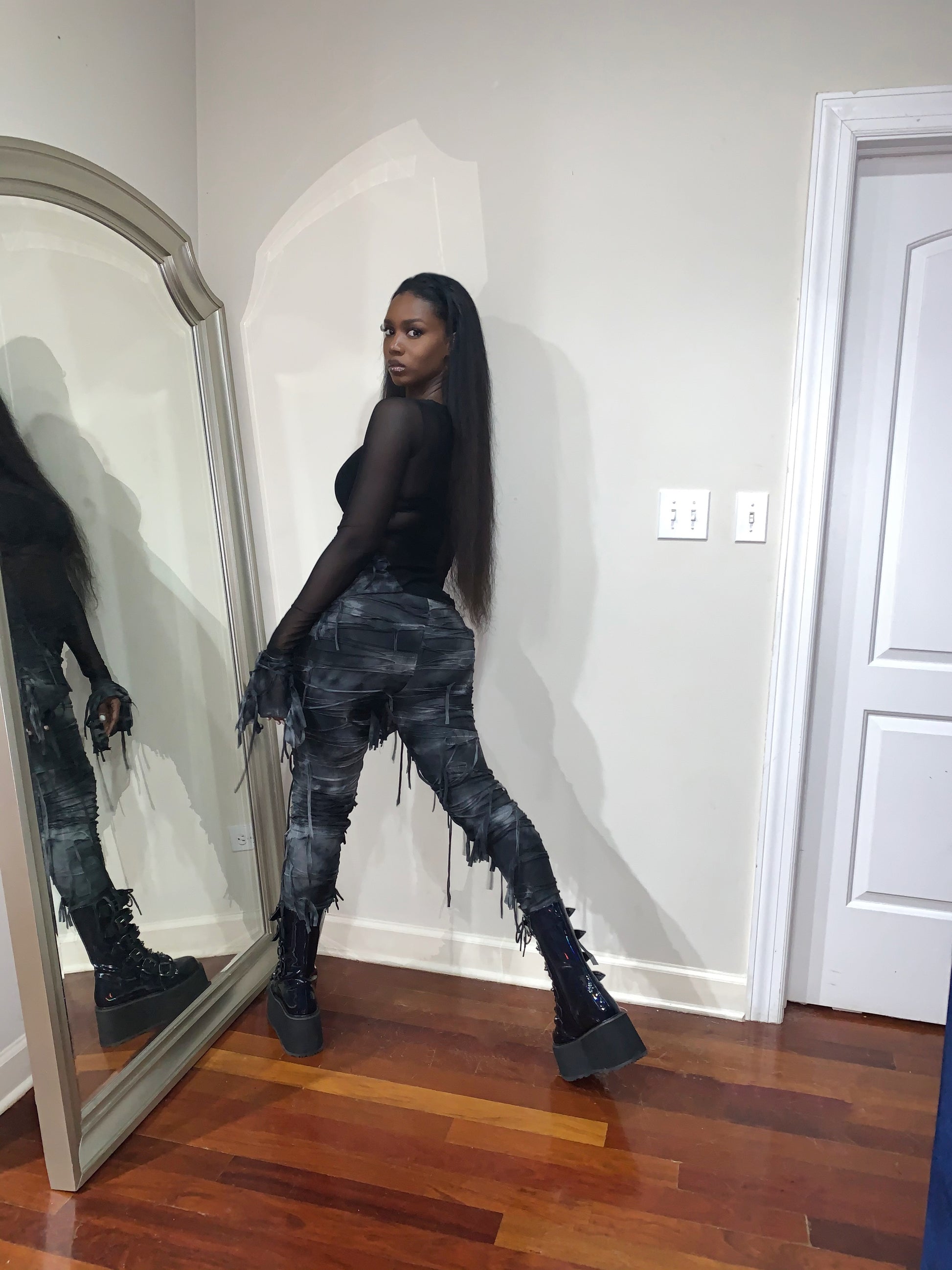 Black mesh long sleeve shirt and matching high-wasted leggings with shredded fabric detail. Very soft and comfortable fabric & has great stretch.
