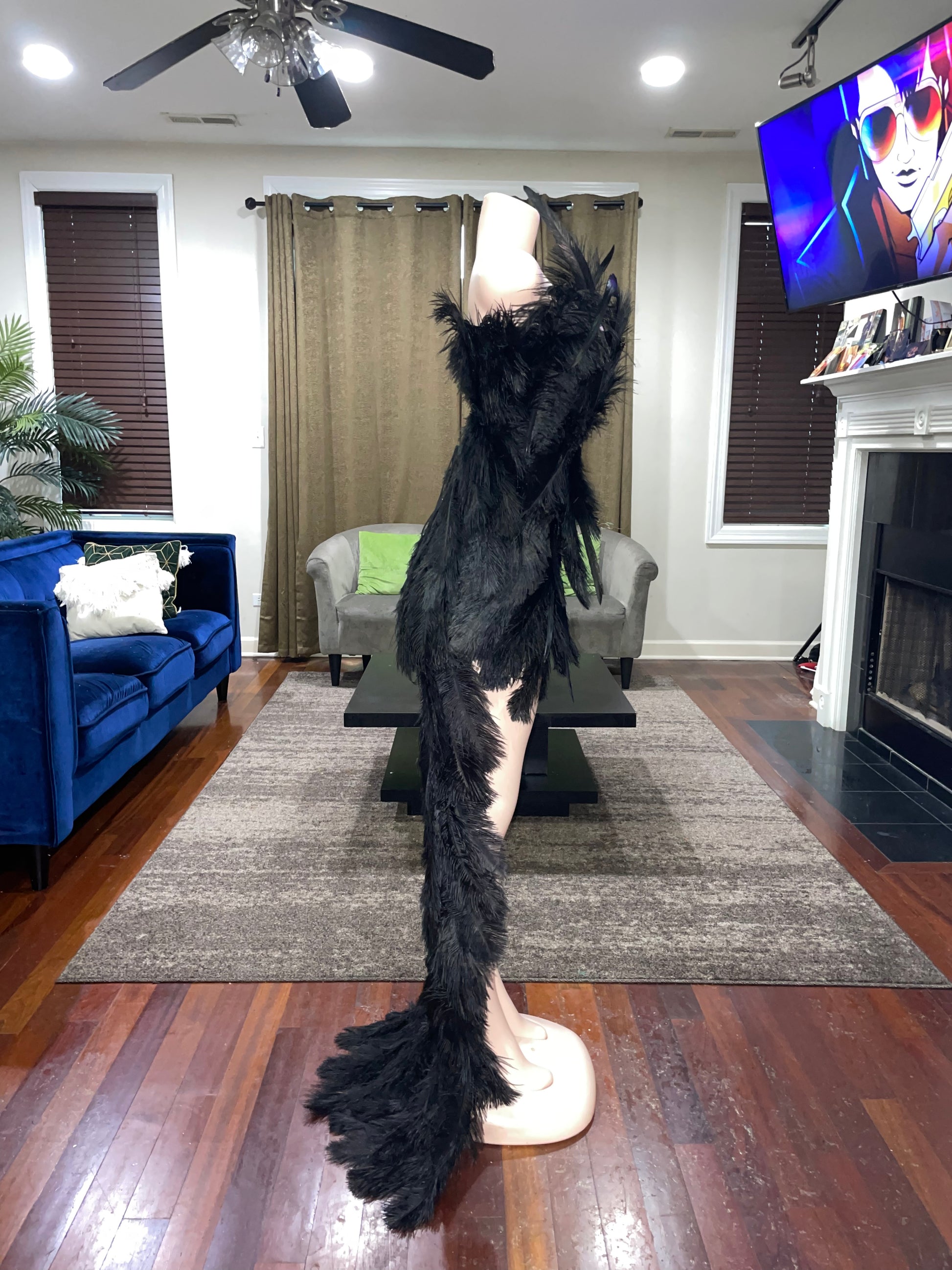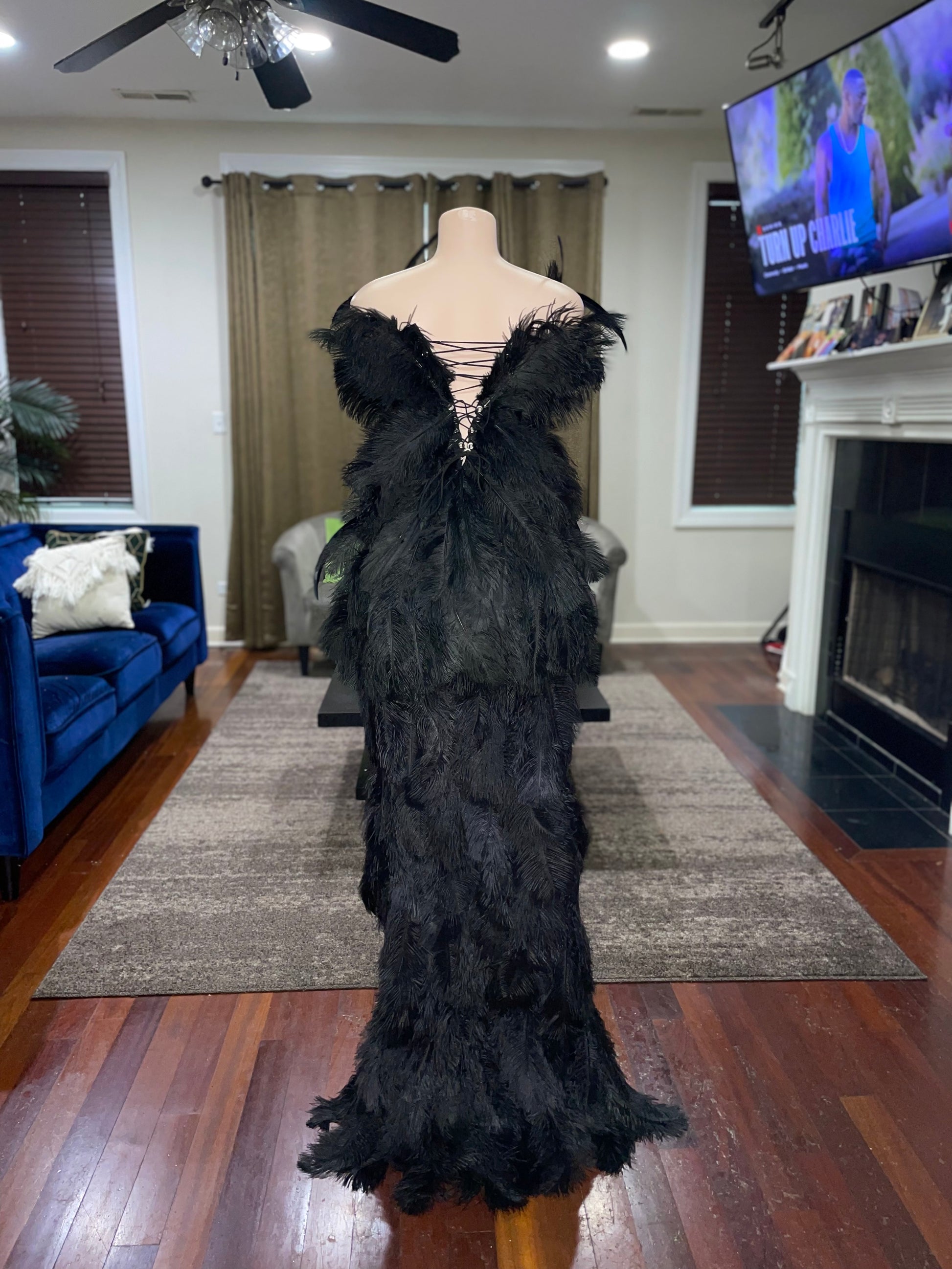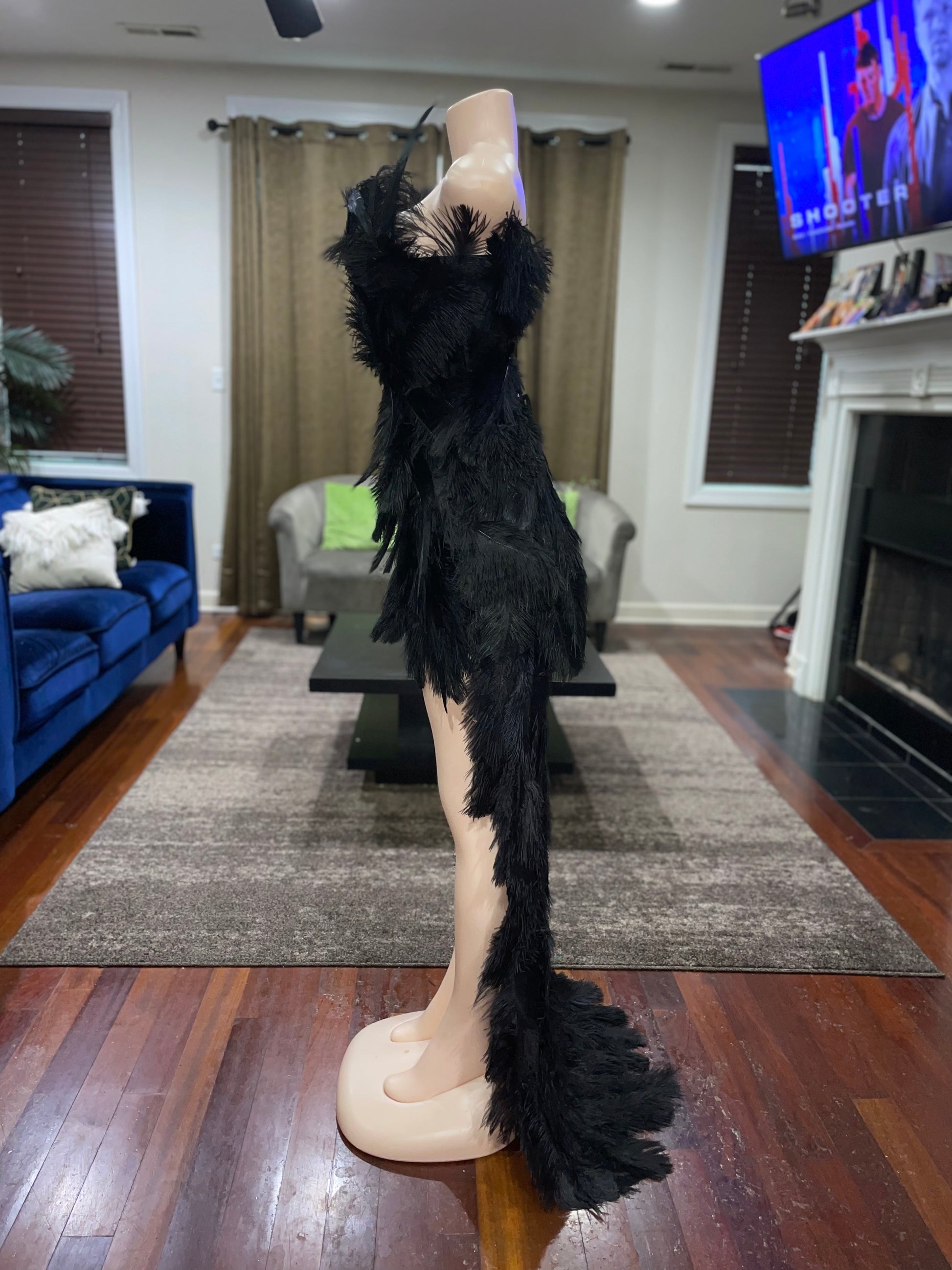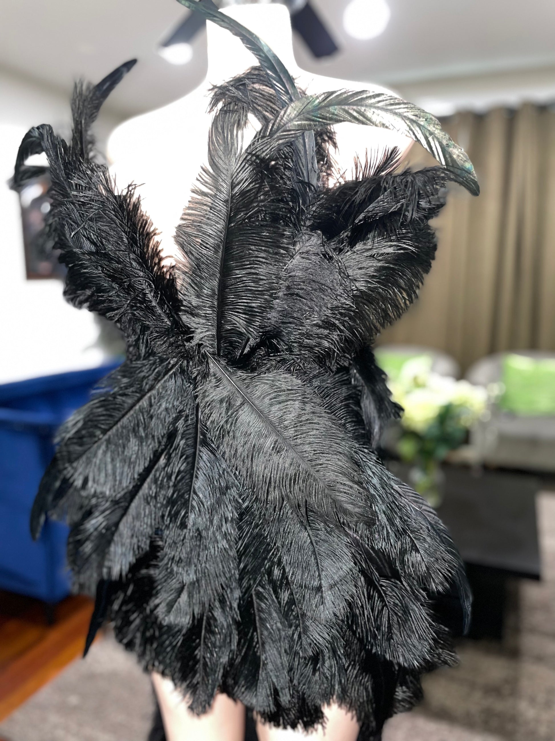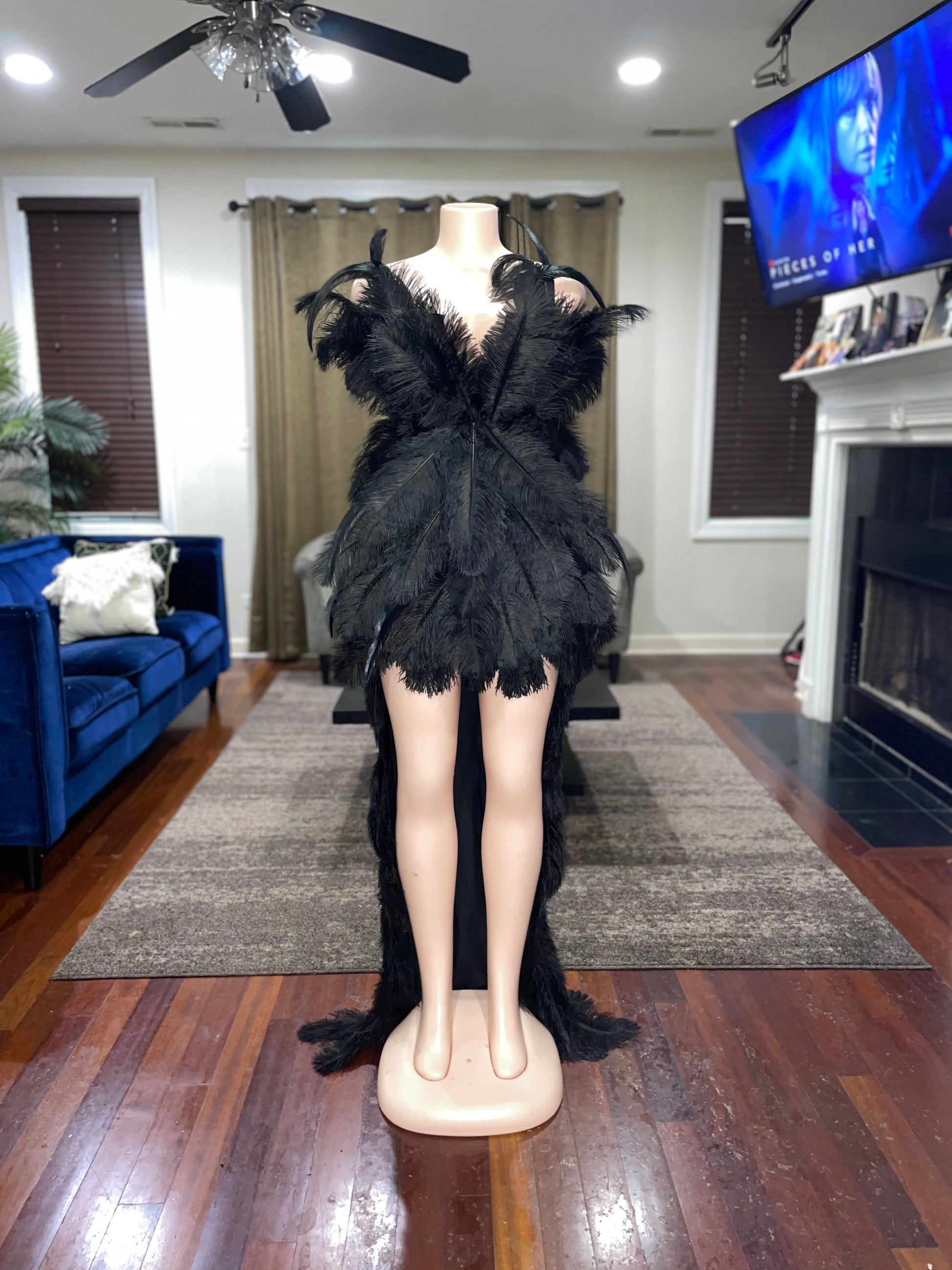 Beautiful form fitting dress, fully covered in Ostrich feathers. Each one strategically placed by hand to create a beautiful unique design. This dress does fit true to size. The back of the dress is finished with grommets and a drawstring which makes it slightly adjustable to accommodate different bust sizes.
