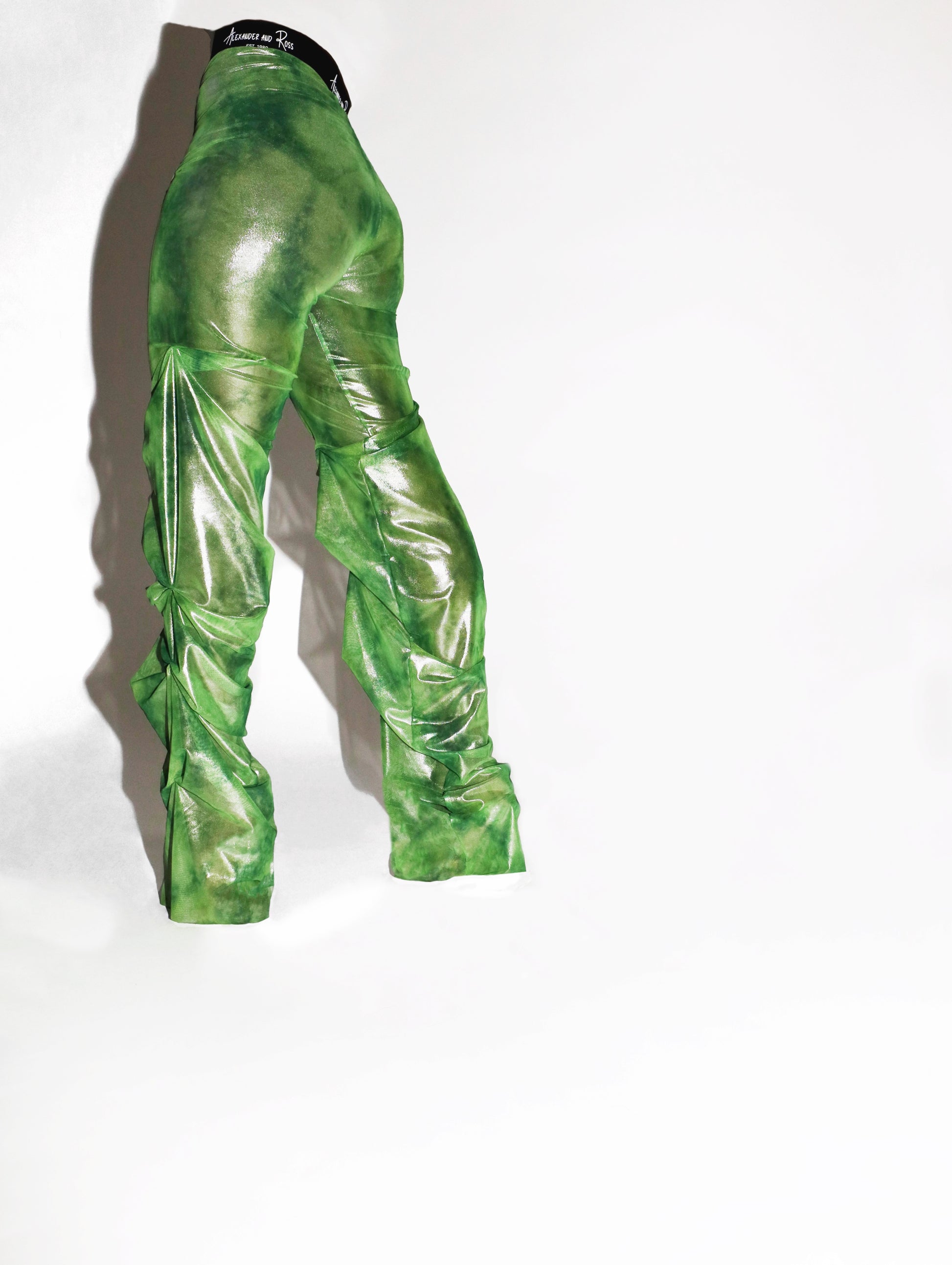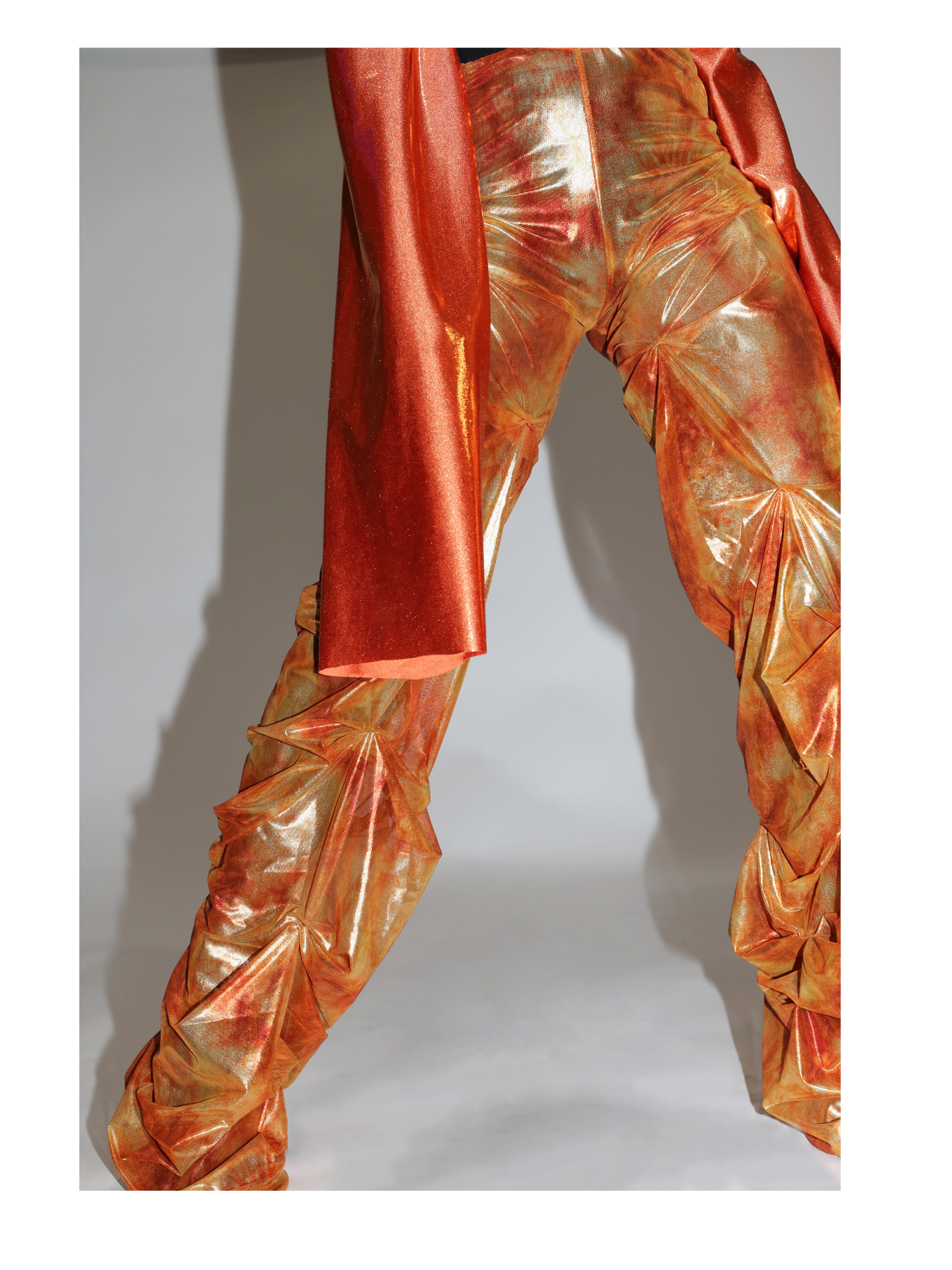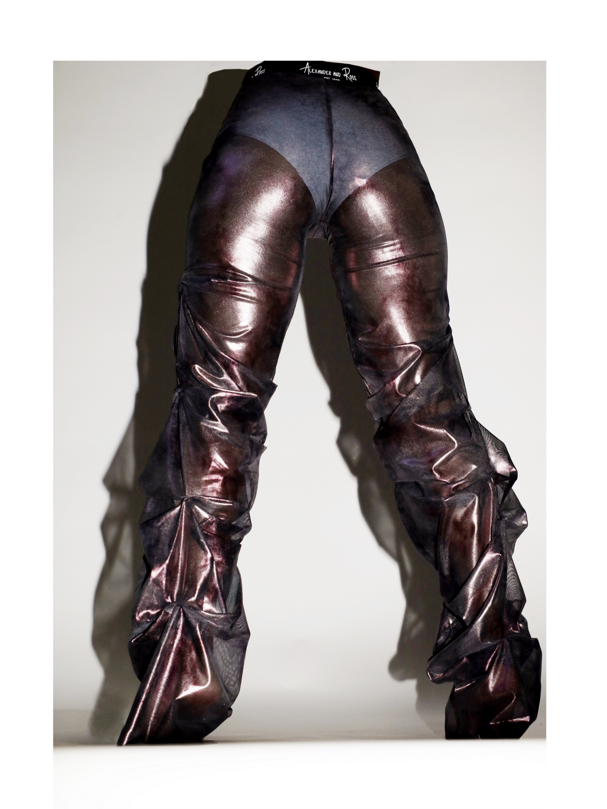 Black/White Logo waistband. Sheer metallic fabric, hand-tacked to form a unique design that gives you everything you need in your new favorite "feel good" pants.