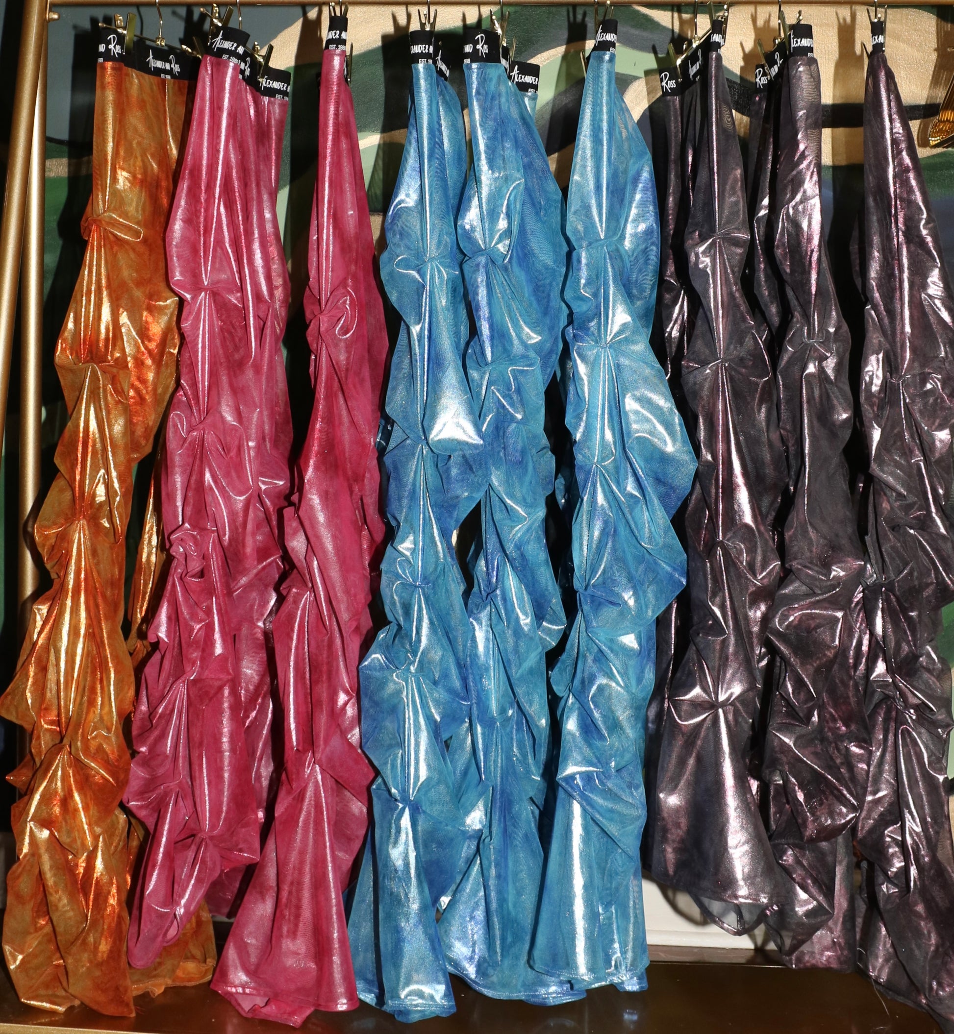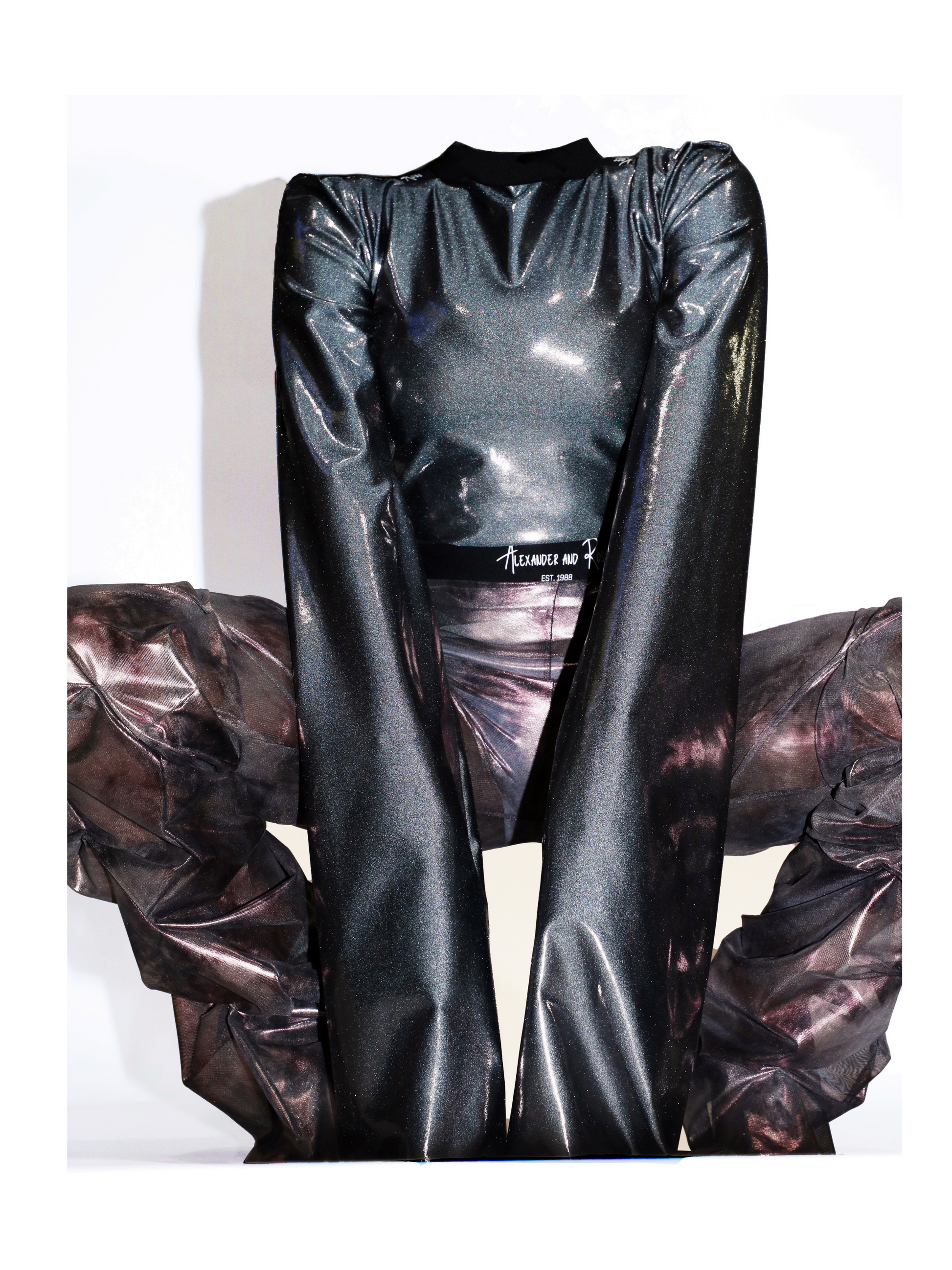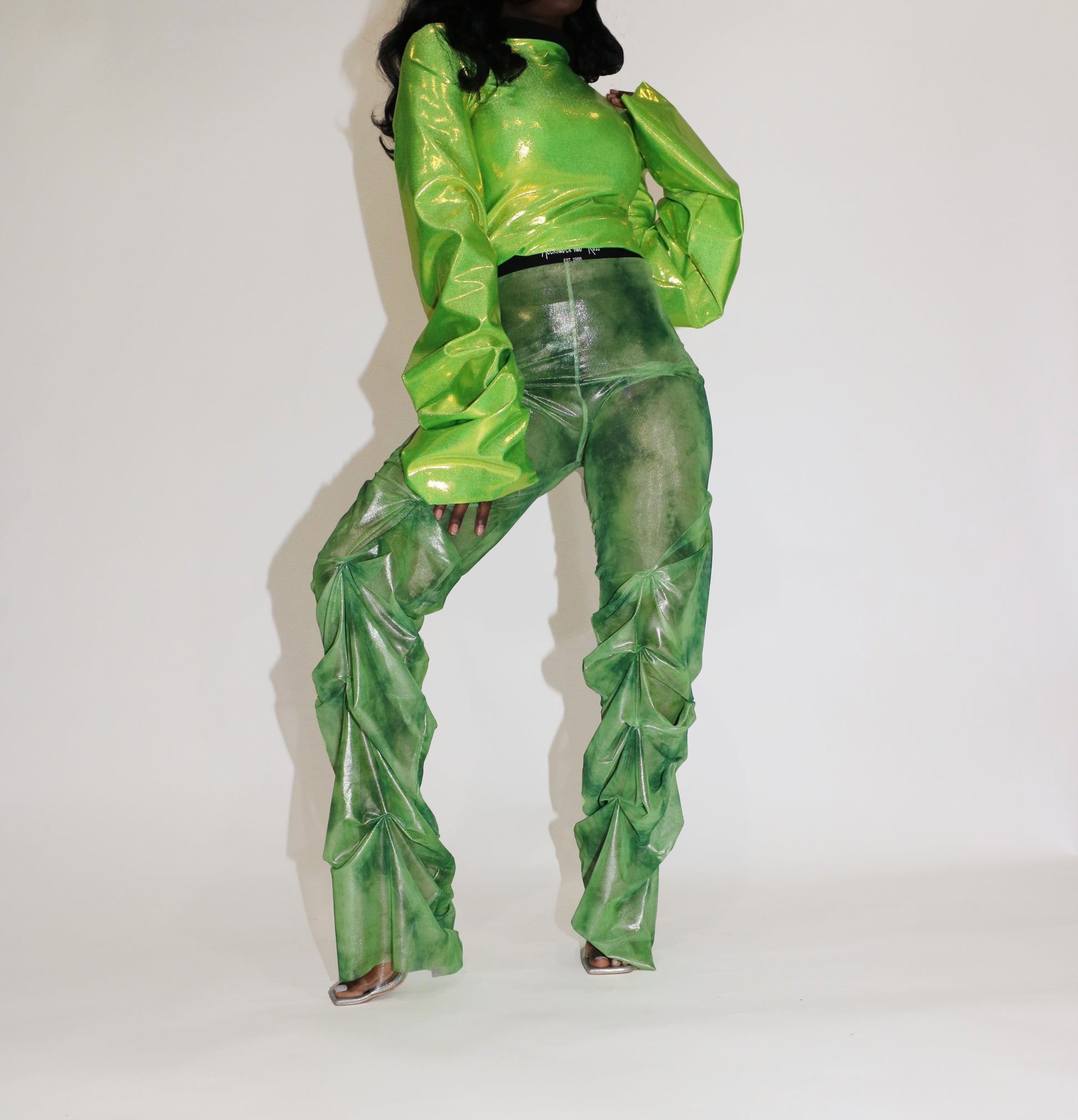 Black/White Logo waistband. Sheer metallic fabric, hand-tacked to form a unique design that gives you everything you need in your new favorite "feel good" pants.